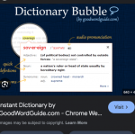 もう一つ、私が勧めている実際的な方法があります。それは Instant Dictionary by GoodWordGuide.com (Dictionary Bubble) をブラウザの拡張機能として入れておくことです。これを入れておくと、英語の記事やニュースを読んでいるときに、わからない単語をクリックするだけで英語の定義が画面に表示されます。辞書を開く必要がなく、その場ですぐ意味を確認できるので非常に便利です。